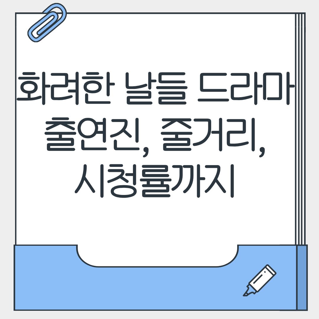 2025 화려한 날들 출연진·인물관계도·줄거리·시청률 총정리2025년 KBS 2TV 새 주말드라마 ‘화려한 날들’이 방영 시작부터 뜨거운 반응을 얻고 있습니다.정일우, 정인선, 윤현민, 이태란, 천호진 등 화려한 출연진과 세대를 아우르는 가족 멜로 스토리로 주말 안방극장을 사로잡고 있는데요. 오늘은 출연진, 인물관계도, 줄거리, 시청률까지 한눈에 정리해드립니다.📌 화려한 날들 드라마 기본 정보방영일: 2025년 8월 9일 첫 방송방송사: KBS 2TV (매주 토·일 오후 8시)장르: 가족·멜로·세대 공감 드라마작가: 소현경연출: 김형석, 박단비제작: 스튜디오 커밍순, 스튜디오 봄, 몬스터유니온OTT 공개: 넷플릭스 동시 공개 🎬 출연진 소개정일우 – 이지혁 (비혼주의자, 건축 자재 회사 대리)정인선..
